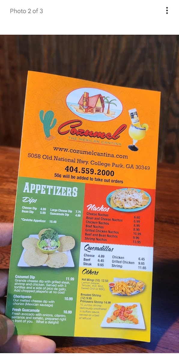 Welcome to Cozumel Cantina, a vibrant culinary destination located at 5058 Old National Hwy, College Park, GA. This eatery captures the essence of *Mexican cuisine*, offering a diverse menu that features everything from fresh salads to mouthwatering fajitas. The *Shrimp Salad* ($18) and *Taco Salad* ($14) receive rave reviews for their freshness and flavor, while the *Cozumel Special Fajitas* ($30) balances tenderness with a delightful medley of spices. Patrons appreciate the *casual atmosphere*, underscored by lively decor and an engaging vibe, making it perfect for gatherings or special occasions. Customer feedback highlights the friendly service and inventive cocktails, particularly the popular *Bob Marley drink*, creating a welcoming atmosphere. While cleanliness might need improvement, the overall experience—great food, efficient service, and a playlist that keeps you moving—sets the stage for a memorable outing. Explore the bold and tantalizing offerings at Cozumel Cantina for a flavorful escape!